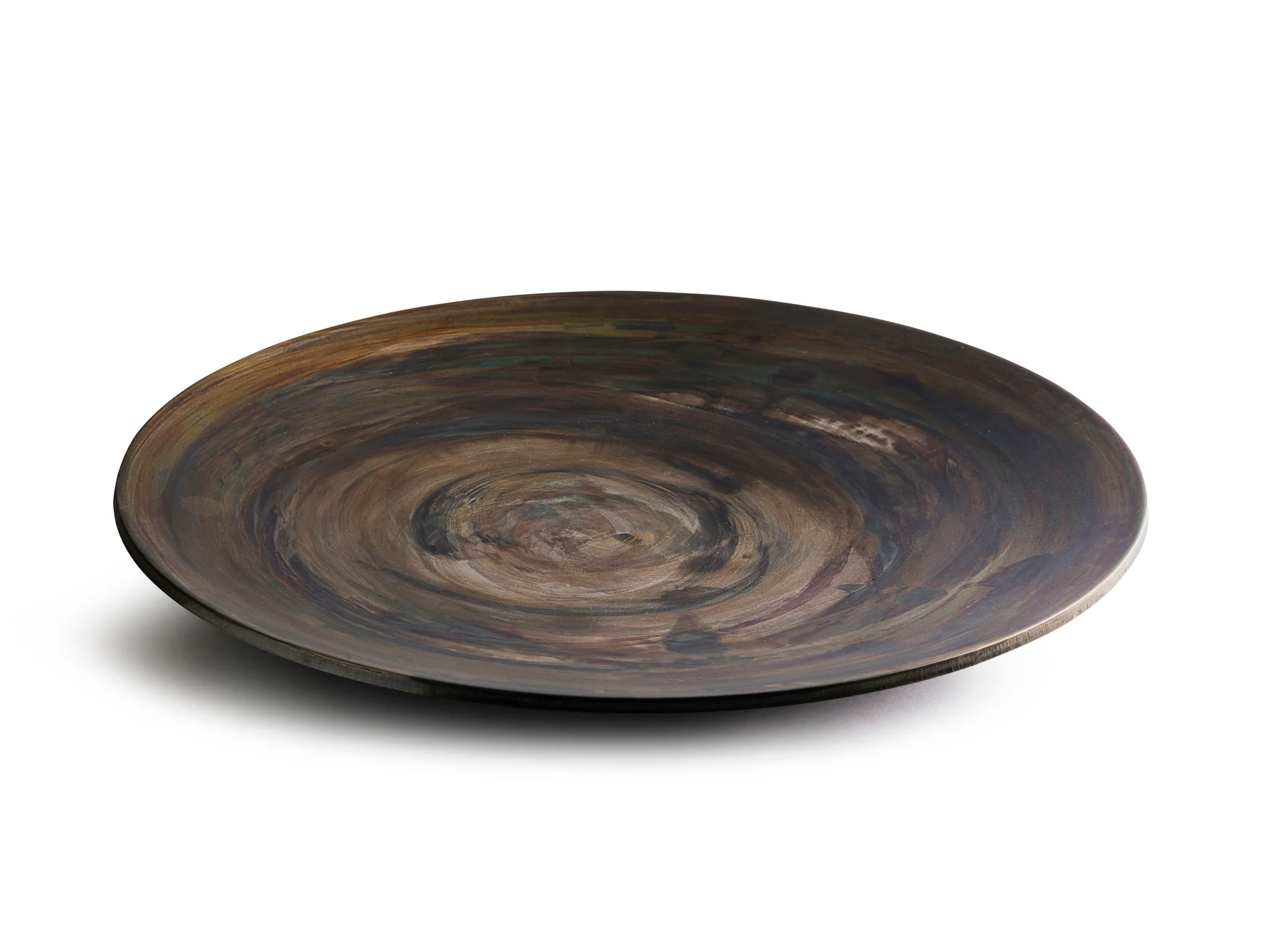 Oggetto dallo stile contemporaneo, perfetto da mettere su un tavolo o una credenza, questo superbo piatto decorativo è sapientemente brunito seguendo la sua naturale concavità. Lo spessore ed il peso importante lo rendono ancora più solido e concreto, un oggetto che non si può non notare. Disegni sorprendenti e astratti, “dipinti a mano” con ossidazione, rivelano un’estetica vibrante e sofisticata.